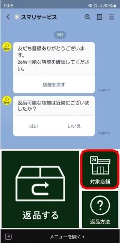 対象店舗を確認後、LINEの「トーク」画面へ戻り、LINE画面上の「返品する」を選択します。