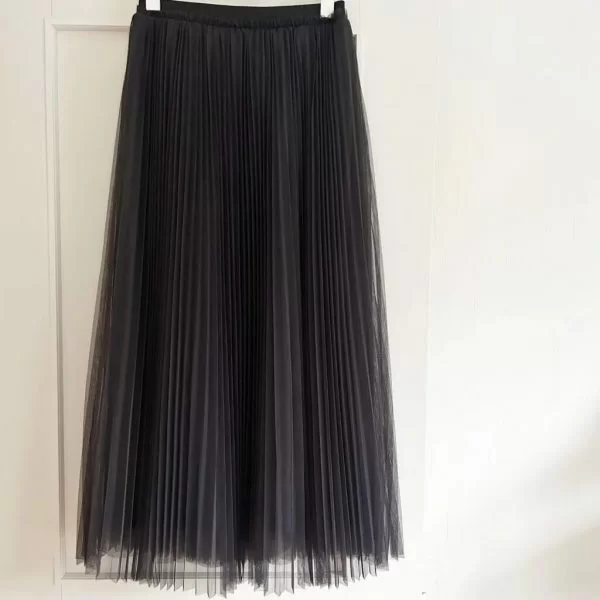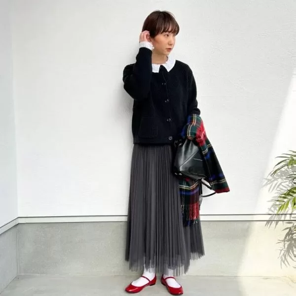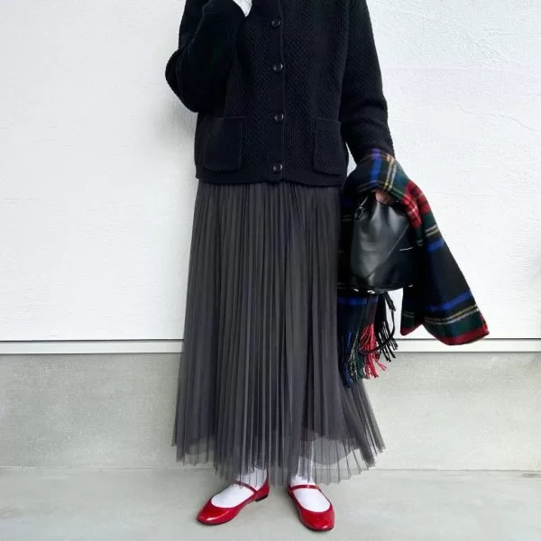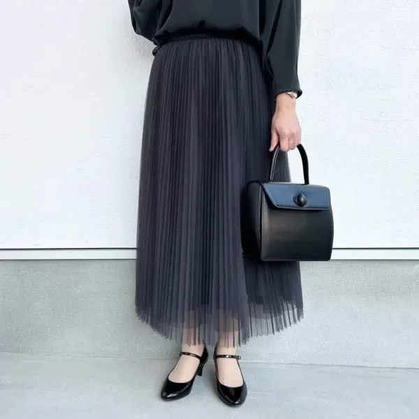 チュールスカートを履くのってなかなか勇気いると思う方もいらっしゃるかと思いますが、こういうダークグレーなどの濃い色はいろんな洋服にも合わせやすいし大人の方にも取り入れやすい挑戦しやすいカラーかなと思います。