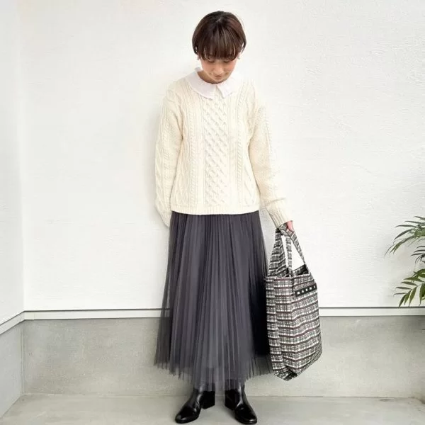 白ニットとチュールスカートと合わせるとやさしい雰囲気コーデになりますね。甘くなりすぎないようにブーツで大人っぽく。