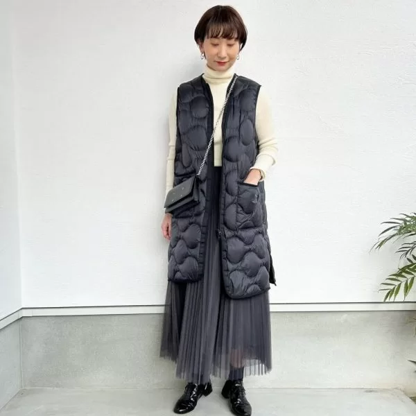 白黒のモノトーンの色で合わせてみました。カジュアルなロングダウンベストとも合いますね。
