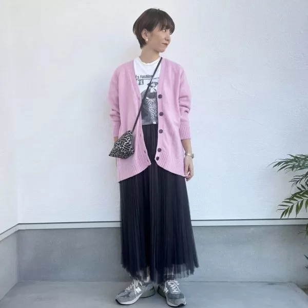 ポイントにピンクのカーディガンを合わせてみました。