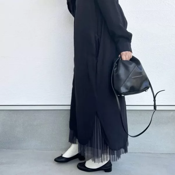 ワンピースにチュールスカートを合わせることで、全体的に重くなりすぎずに、抜け感が出ます。