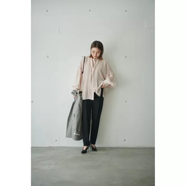ゆったりオーバーサイズのシルキーなブラウス。ヒップが隠れる長め丈なので、裾を出してチュニック風にも着られます。ボウタイは前でもサイドでもリボン結びにもできて、外せばクールなバンドカラーのシャツに。そして、合わせたきれいめテーパードパンツ、実はニットパンツなんです。センターシームの美脚シルエット、そのうえシワにならず着心地最高なので、お仕事服としても活躍しそう。