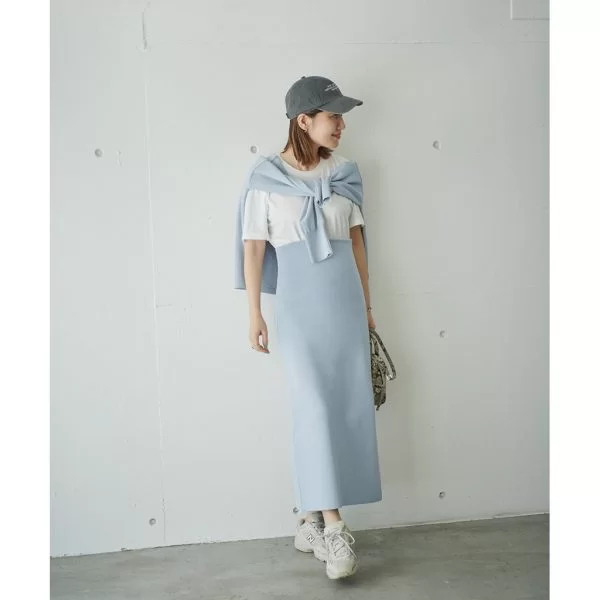 トップスを入れても出しても様になる高めのハイウエストで、誰もが脚長になれる美人スカート。伸縮性のある厚手のミラノリブだから、フィット感がありつつも身体のラインを拾いにくく、タイトなシルエットも楽ではきやすいはず。スモーキーな淡いブルーは、効かせ色としても映えるし、ライトグレー感覚でコーディネートしても素敵。同素材ニットとセットでそろえて、色々アレンジしたい。