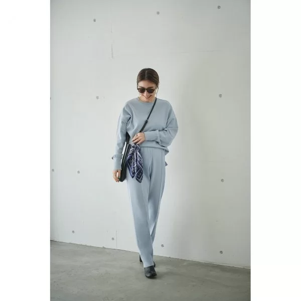 楽に着映えて単品でも活躍するニットのセットアップを作りたくて。身体が中で泳ぐボクシーなシルエットが新鮮なクルーネックニットは、裾をインしてもアウトにしても決まるよう着丈に前後差をつけて。トップスがゆったりしている分、パンツはセンターシーム入りのテーパードシルエットですっきり仕上げました。上下ニット合わせでも決して部屋着風にならず、モダンな印象を楽しめます。