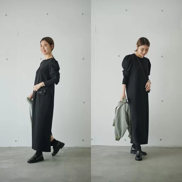 ボリューム袖のニットワンピースは、パンプスでフォーマルに、スニーカーでカジュアルにとあらゆるシーンで映える一枚。袖にきれいな立体感が出るよう、タックの入り方を何度も調整しました。冬はアウターやジャケットを羽織ることを考え、身頃はすとんと落ち感のあるシンプルなデザインに。さりげないコクーンシルエットは、着る人の体型を選ばずバランスよく見せてくれます・