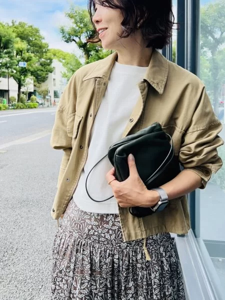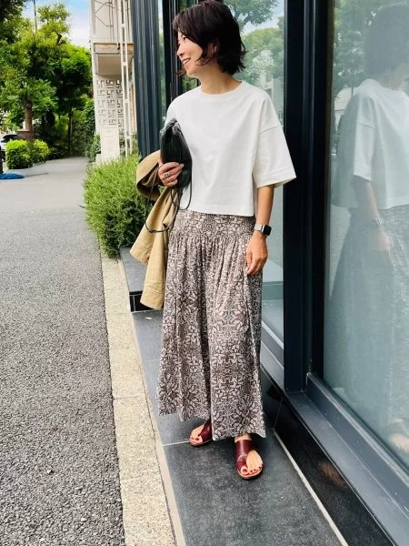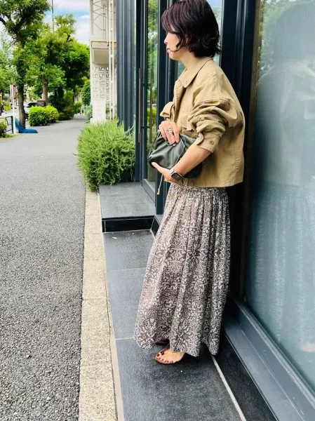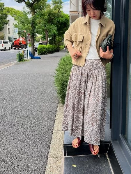 編集部の方たちと、吟味に吟味を重ねて選んだプリント素材。大人っぽい柄やニュアンスカラーの絶妙なカラーリングなど、すべてとても気に入っています。サラサラと肌触りの良い素材で、こんなふうにTシャツ合わせはもちろん、冬にはモヘアニットなどと合わせても絶対に可愛い、と断言できます(笑)。フレアのボリューム感もちょうどよく、腰下で切り替えがあるので、お腹がぽっこりしないところも大人にはありがたい〜!!