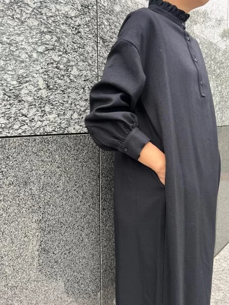 「一枚で着ても華やかで、歩いたり、風になびく姿にどこか余韻を感じられるようなワンピースが、大好きなんです。今回はそこにフリルの立ち衿でクラシカルさをプラス。おしゃれに体型カバーができるサイズ感にもこだわりました。」