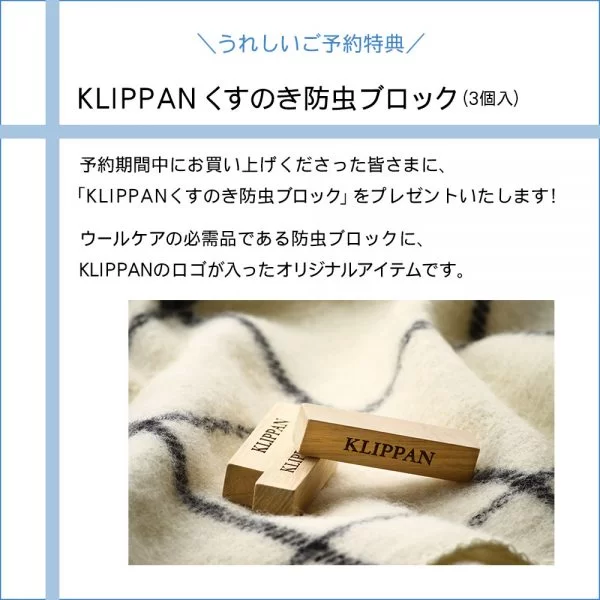 10/3(月)まで予約特典受付中です! 一部のウールアイテムを予約購入された方に「KLIPPANロゴ入り・オリジナル防虫ブロック」をプレゼント