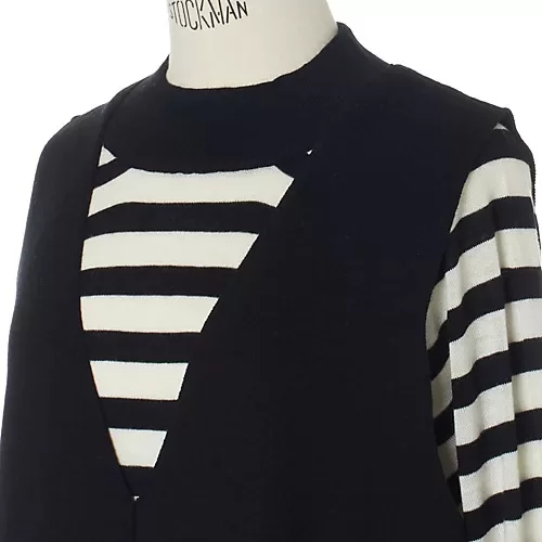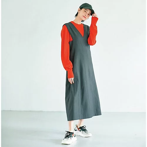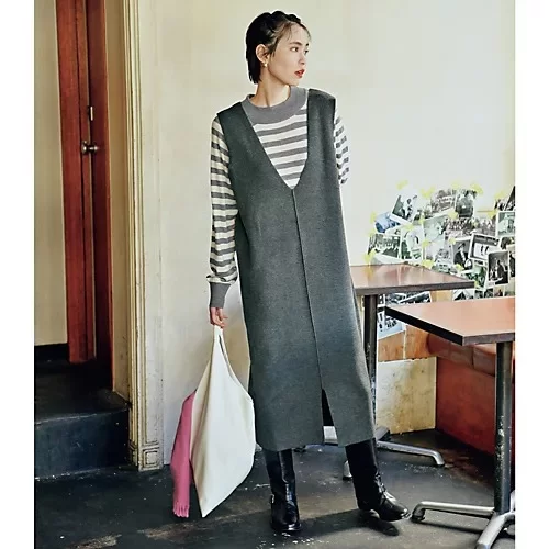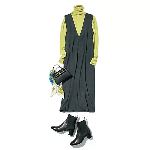 - こちらも累計401枚売れたヒット作。今回はニットをボーダーに替えより着映えと着回し力を強化!’22年1 月号の初登場では無地同士だったセットアップをリデザイン! ボトルネックと袖口にアクセントをつけたボーダー柄チュニックは、一枚でも決まるサイドスリット入り。深VネックのジャンスカはスッとしたIライン。裾には前後どちらでも着用できるセンタースリットを施しています。優しいコントラストのチャコールグレーと、王道のブラックで展開。