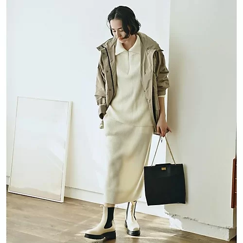 Chaos プリズムライトブルゾン ¥57,200/SLOANE 【HPS別注】ハーフZIPリブニット ¥36,300/SLOANE 【HPS別注】ニットリブスカート(サイドポケット付き) ¥34,100/MARITAN <別注>チェルシーブーツ ¥35,200/IRIS47 eau earring ¥15,400