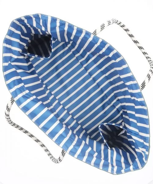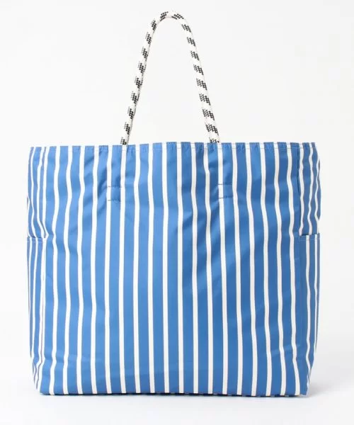 リバーシブルで使える内側は明るいブルーのストライプ柄で、どちらもシーンやコーディネートを問わず持ちやすいカラーリングです。アイボリー×ブラックのロープハンドルもアクセントに。サイズがミディアムとラージの二種類で、カラーは3色ご用意しています。