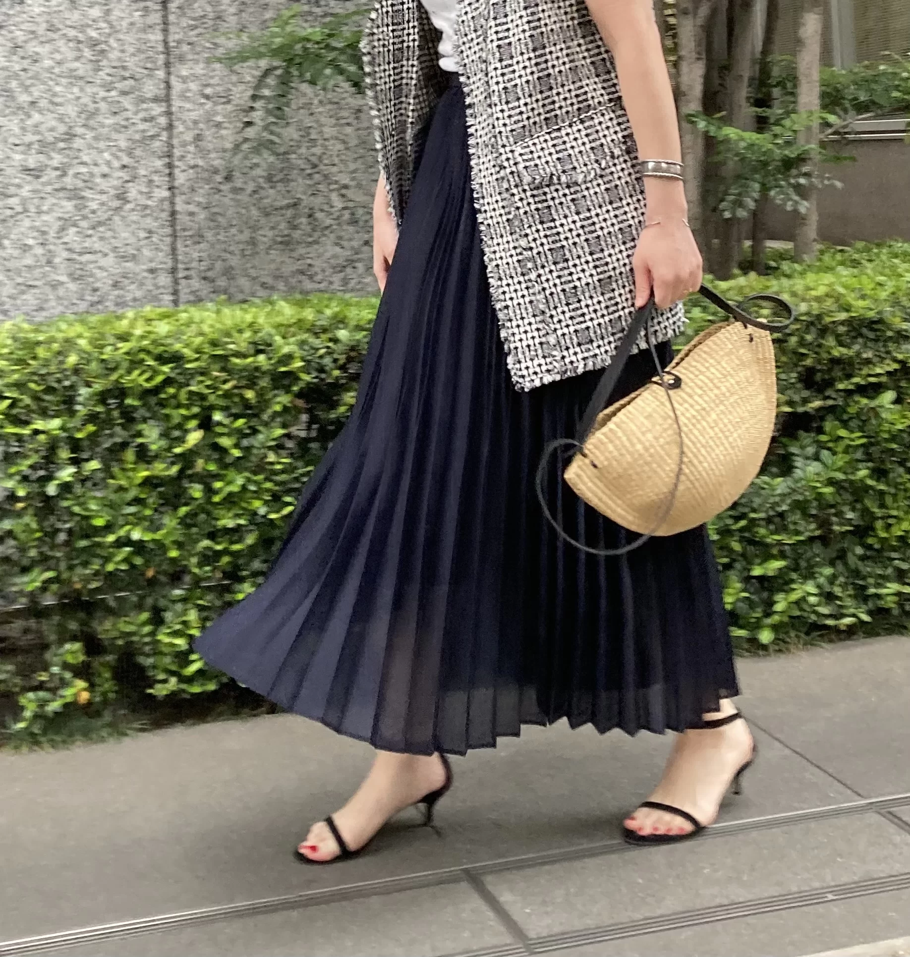 細いプリーツから裾に向かって広がっていくモードなデザイン。歩く度に動きが出ます。