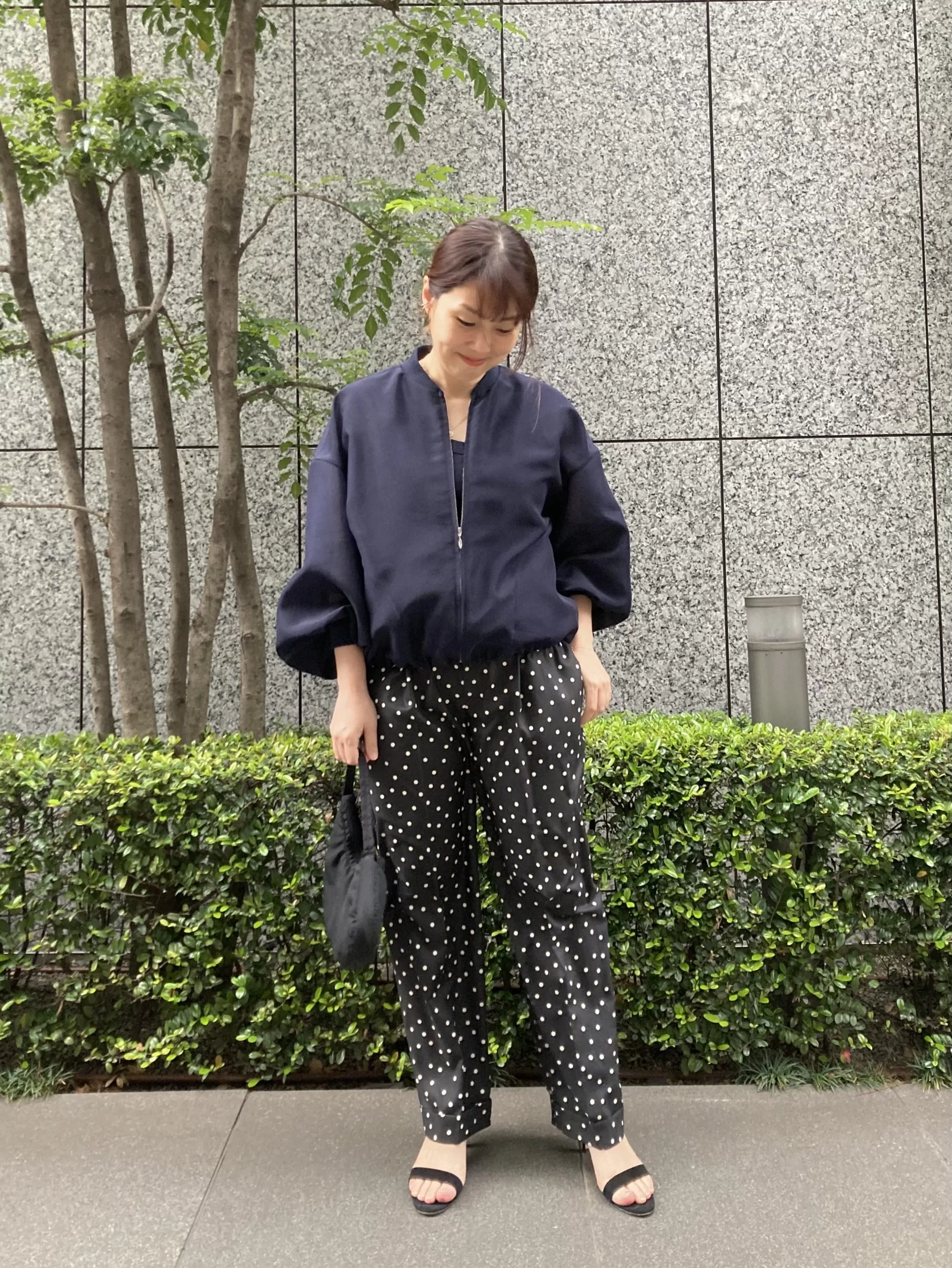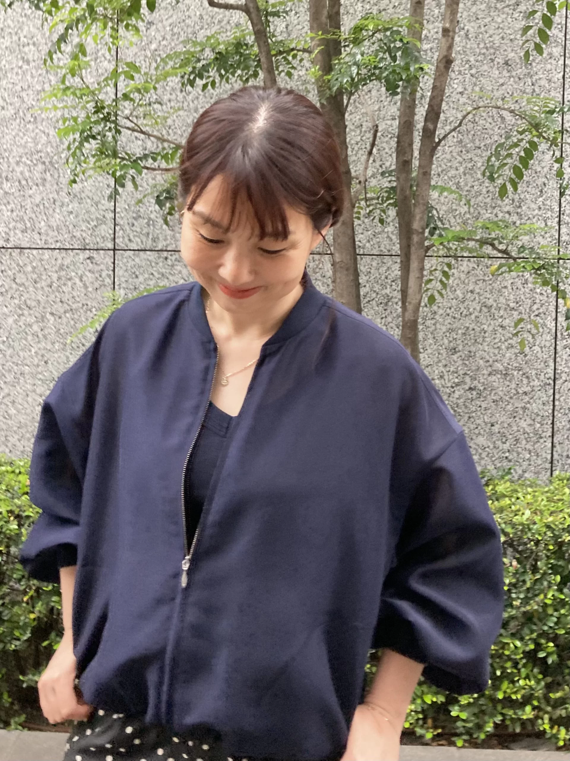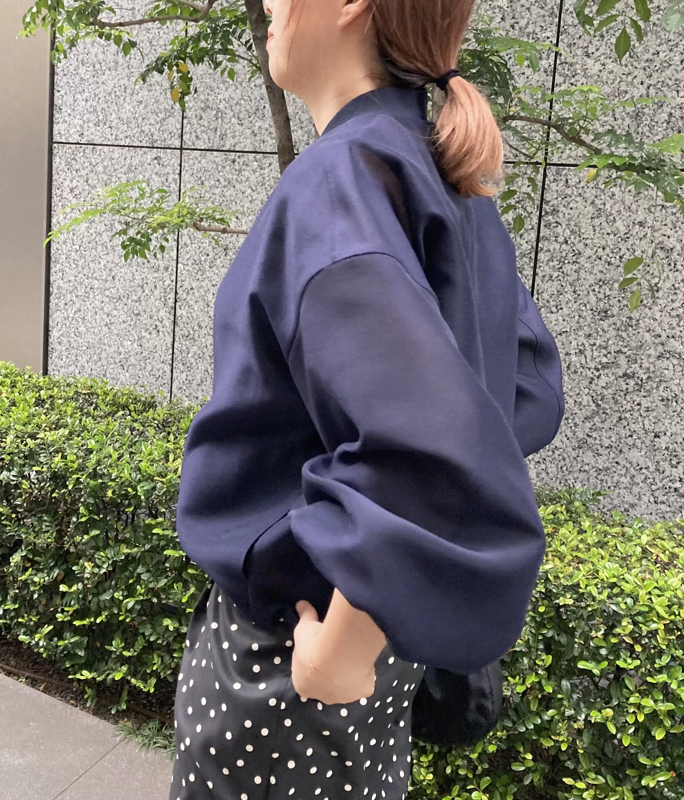 シャープなブラックと違い、ネイビーはほんわか優しい雰囲気に。ハリと艶のある素材で上品見えするので通勤にも◎。オーガンジー素材は軽くて着心地もGood。主役感のあるブルゾンですが、ベーシックなので着回し力は抜群♡