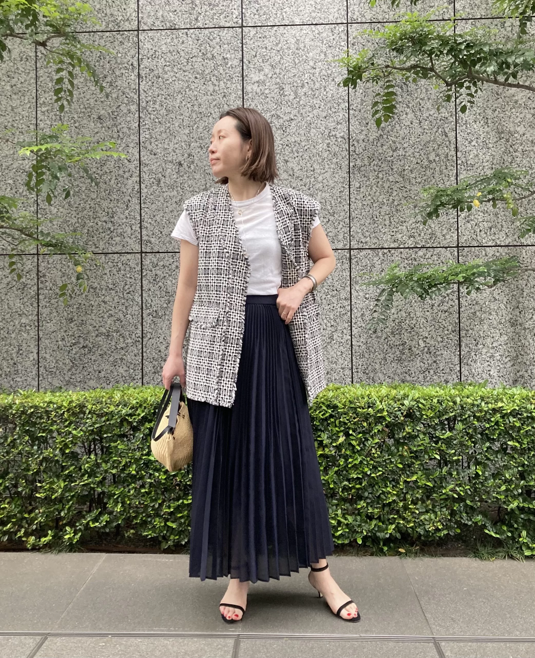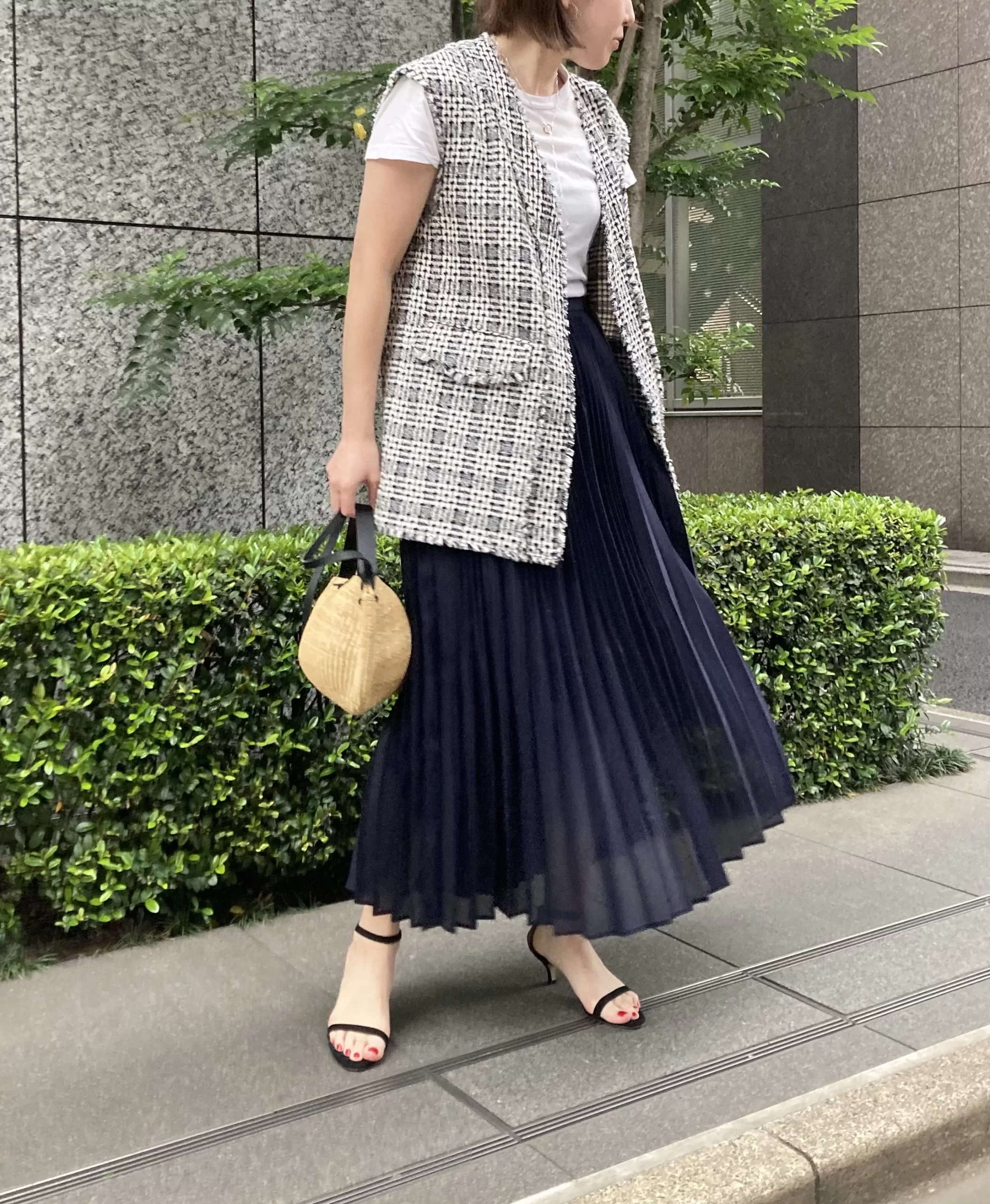【uncrave WHITE】SHEERプリーツスカート¥24,970 /TAKUMI TWEED CHECK ジレジャケット¥35,970
