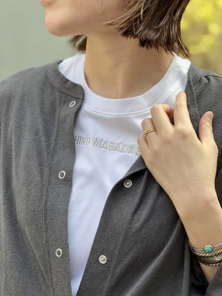 ロゴの位置はネックレスとのバランスも考えて配しました。カーデやジャケットを羽織っても見えるけど、落ち着きの合るカラーリングでさりげなく。