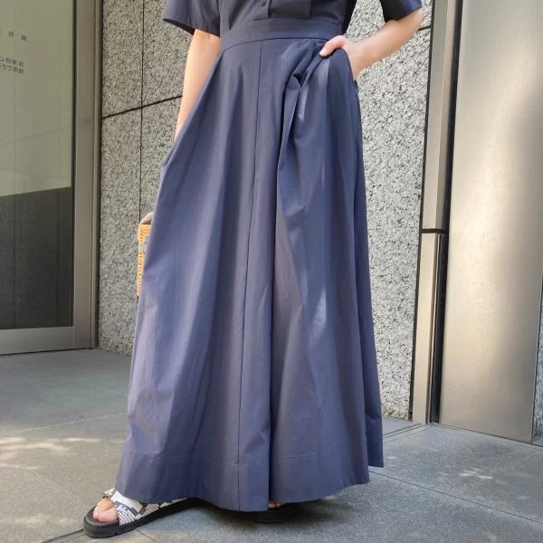 欲しかったのはランチや仕事、旅行など、夏のあらゆるシーンに活躍するワンピース。ただ楽なだけでなく“様になる”ことも大事だったので、軽くて動きやすい4WAYストレッチ素材をきれいめなシャツ型で仕上げました。体を入れただけでメリハリシルエットが楽しめるように、ウエスト位置を高く、スカートの生地もボリューム満点に。長めのマキシ丈も1cmずつ丈差をつけるなど、どんな身長の方でもバランスよく決まる3サイズで作りました