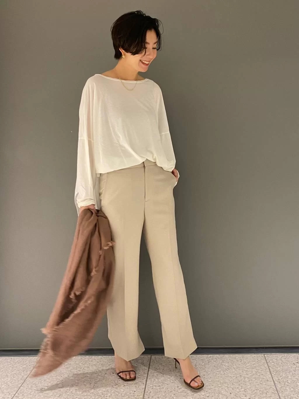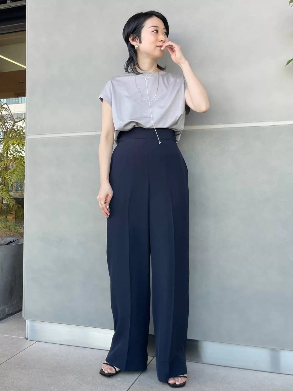 デイリー使いにぴったり!カジュアルからきれい目コーデにも合う、フレンチ袖のゆるTシャツ。ばっちりウエストマークが効いたパンツをシンプルなTシャツで引き立てたスタイリング。足元はヌーディーに女性らしさを覗かせて。