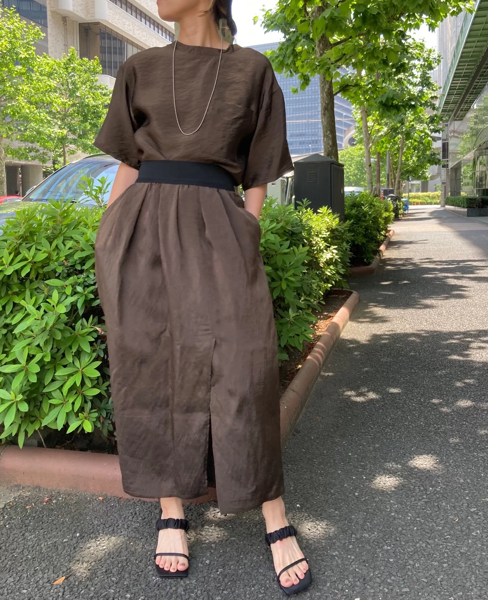 深めのスリットからさりげなく肌見せすることで足元がとっても軽やかに見えます。黒でグッと引き締めたウエストリブベルトがモード感をプラス。
