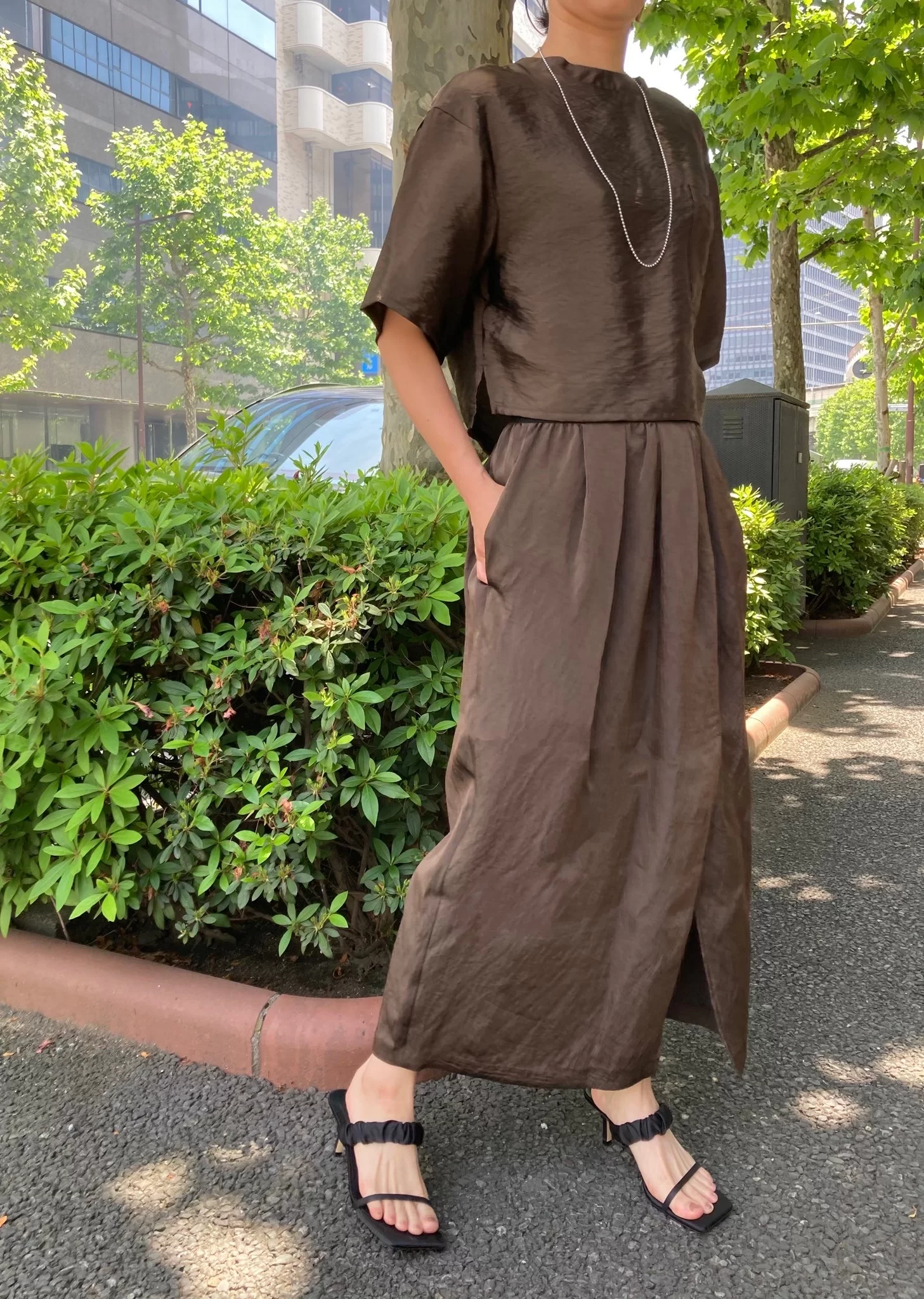 とろみと少しハリ感のある軽やかなTブラウス&コクーンスカートのセットアップ。タンブラー加工が施され、ふっくらとした風合いと陰影のついた光沢が高見えします。ナチュラルなシワ感も気楽に着れるポイントで、お家で洗濯できたりとイージーケアも魅力。