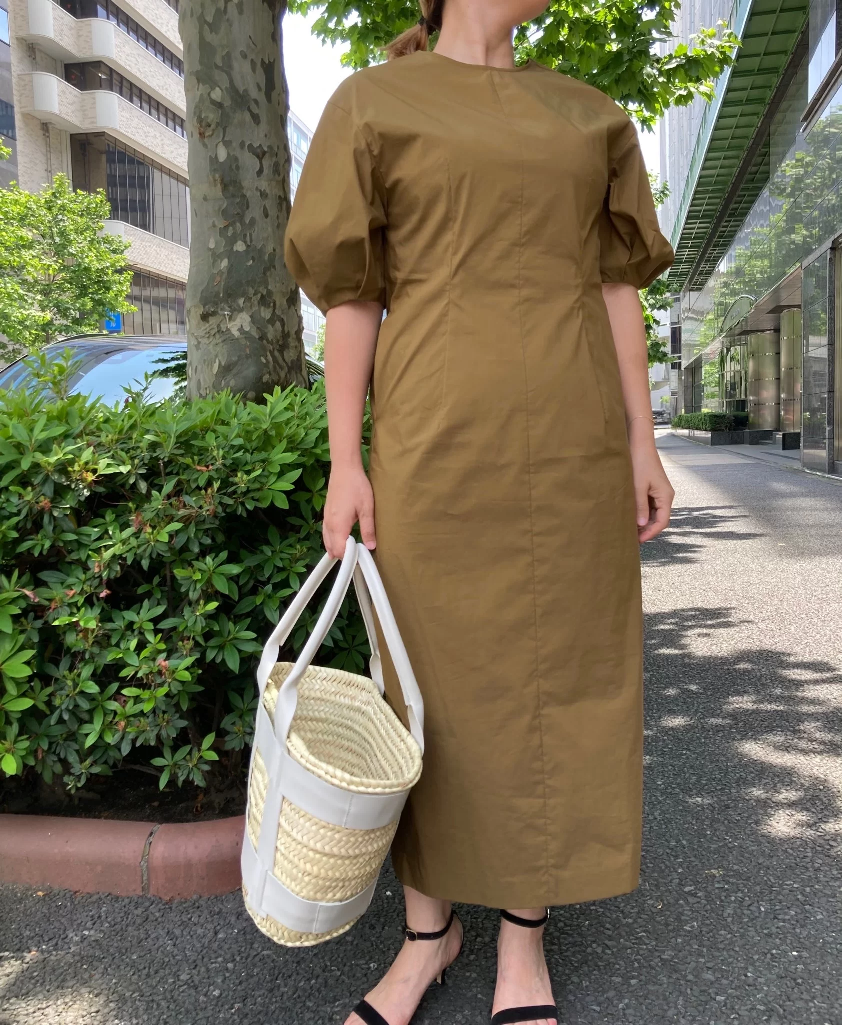 ハリのある高密度なタイプライター生地に撥水加工を施したワンピース。ドロップショルダーのボリュースリーブ、コクーンシルエットでややボディコンシャスなデザイン。生地に伸縮性があって軽くさらっとしているので着心地も良くストレスゼロ。