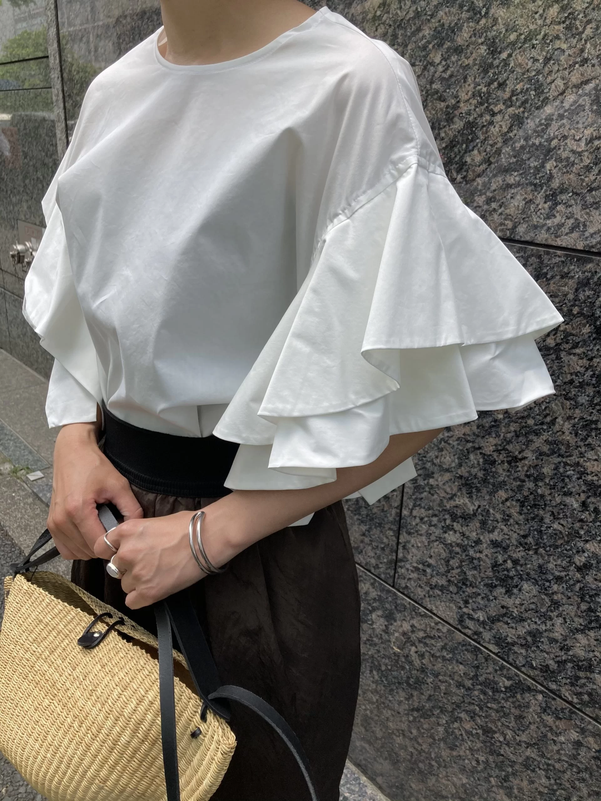 ワンピースと同じ撥水加工付きのタイプライター生地。2重になったおおきなラッフルスリーブがとっても華やか。梅雨時期に真っ白なブラウスを着るのは多少勇気がいるけれど、機能性アイテムなら怖くないですね。