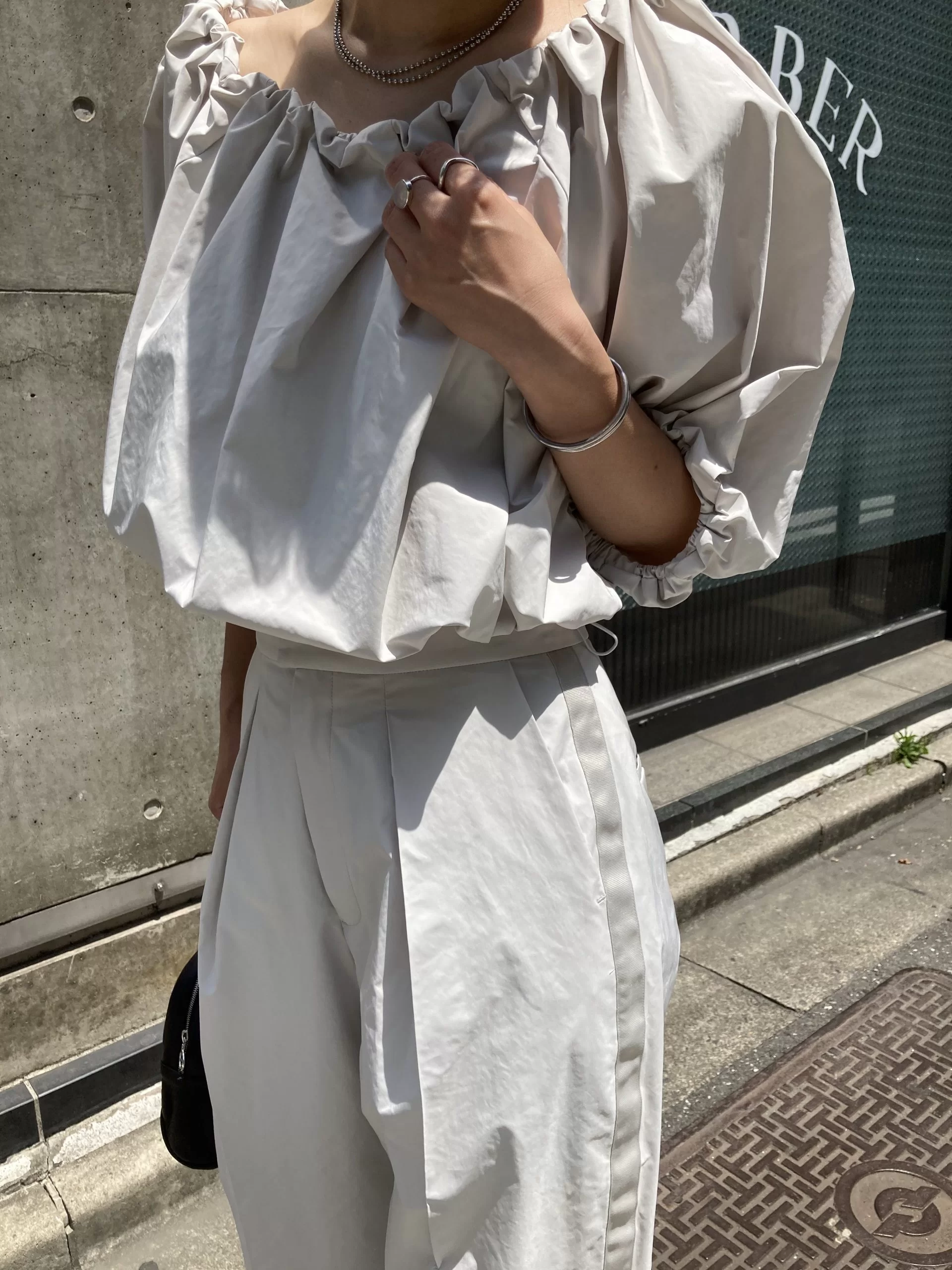 少し光沢のあるシャカシャカっとした肌ざわりのタフタ素材に撥水加工を施した高機能なセットアップ。トップスはオフショルダーにすることもできるので、オフの日やリゾートなどで肩だしを楽しんでも◎洗濯機で洗えちゃうのも嬉しい。