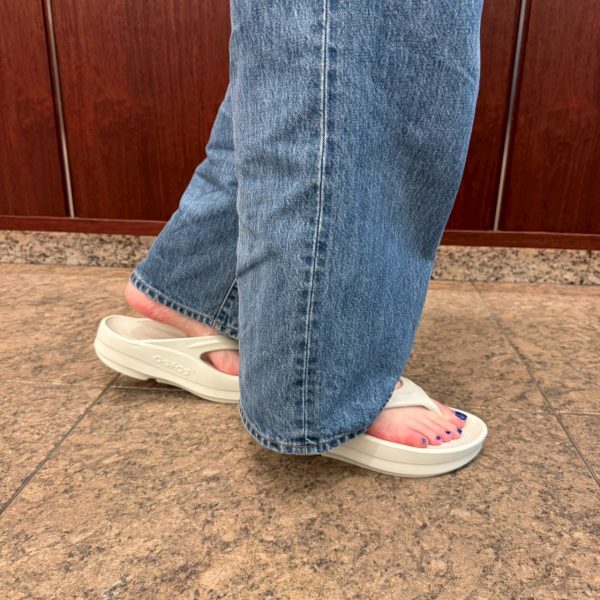 暖かくなるとほぼ毎日OOFOSを履いています! ソールが足にぴたっと寄り添ってくれるので、長時間履いても疲れにくく(トング部分も痛くなりません!)、なによりどんなボトムとも相性がいいのが◎