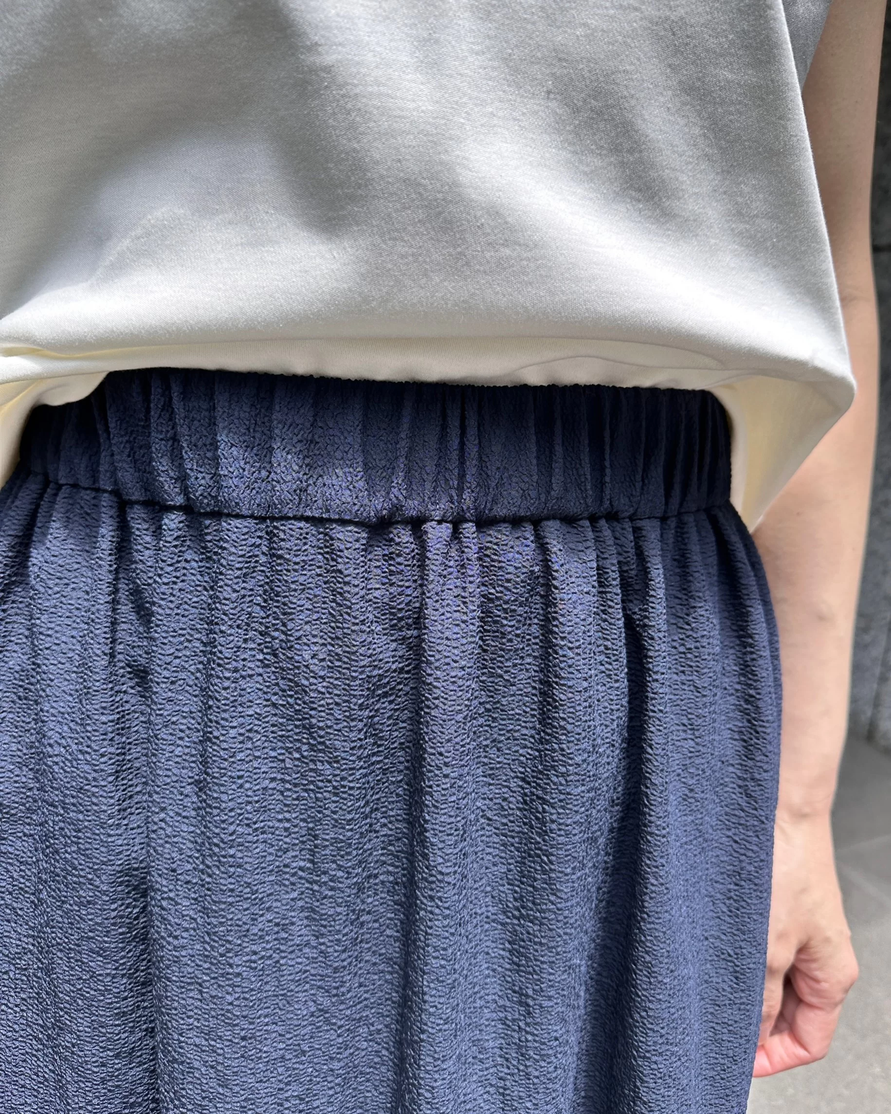 ウエストのギャザーは量感控えめ、膝下のティアードはたっぷり揺れるメリハリ設計。シボの入ったシアー感のある生地で繊細な雰囲気に。