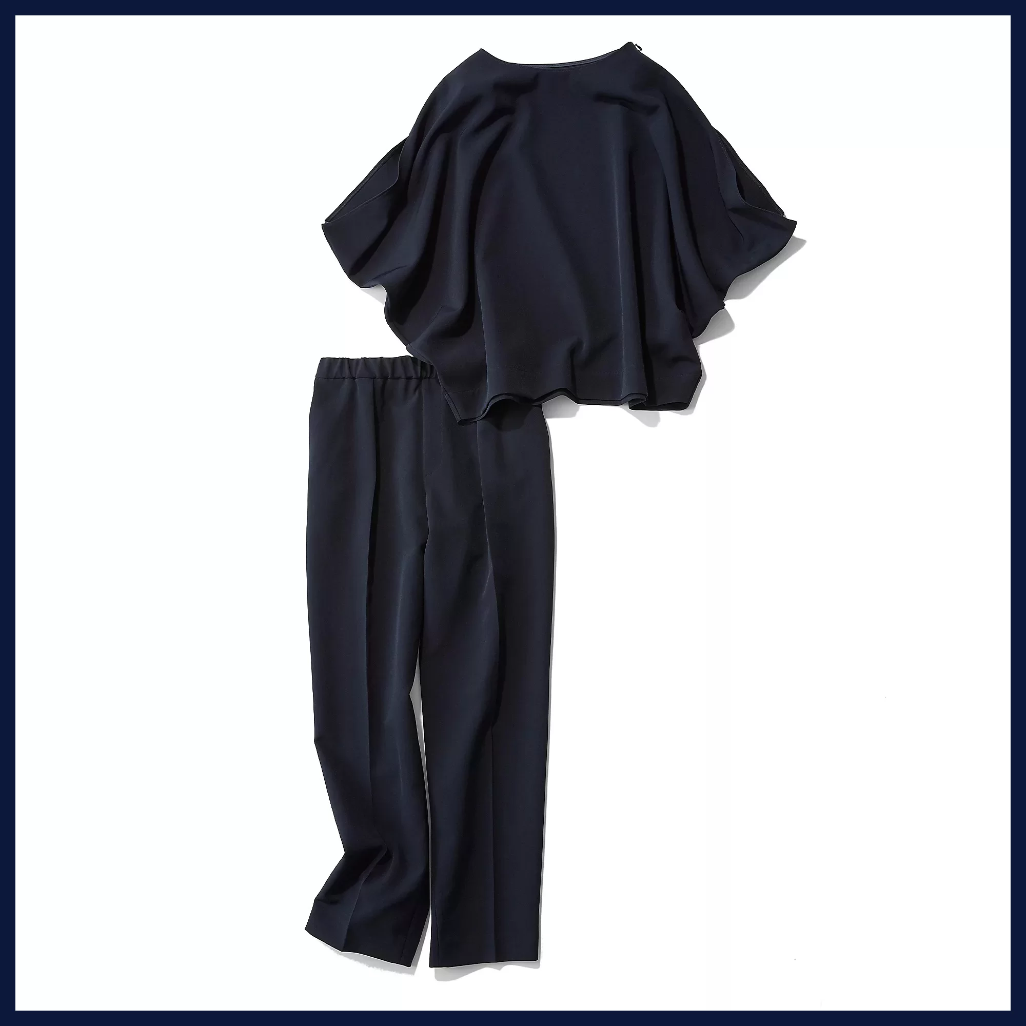 縦横に伸びる2WAYストレッチでストレスフリーな着心地と、落ち感のあるとろみ素材できれい見えが叶うセットアップ。ゆったりしたサイズ感と袖の変形デザインのトップスは、体をすっきり見せてくれる。パンツは脚がまっすぐ見えるディテールにこだわり、センタープレス入りかつサイド寄りのポケットがポイント。