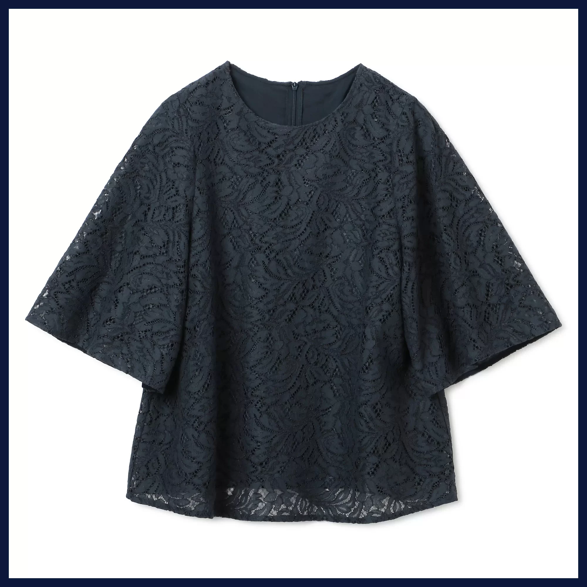 たっぷりとしたレース素材の華やかさと落ち着いた色みのコンビネーションで、甘すぎず大人っぽく。身頃と袖にたっぷりとしたフレアが入っているので体のラインが出にくく、さらっと着るだけで決まる。すそをアウトにしてカジュアルパンツとのミックス感を楽しんで。