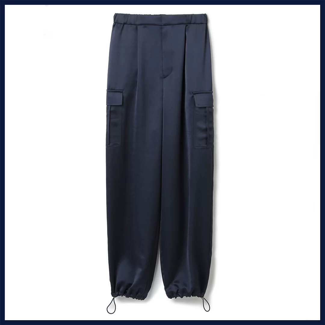 きれいめ派におすすめしたいカーゴパンツといえばこれ!ヴィンテージ感のあるサテン素材の艶が女性らしく、しなやかなシルエットで脚がほっそり見える。ヒールの靴とも合わせやすく、ウエストゴム仕様だから快適。