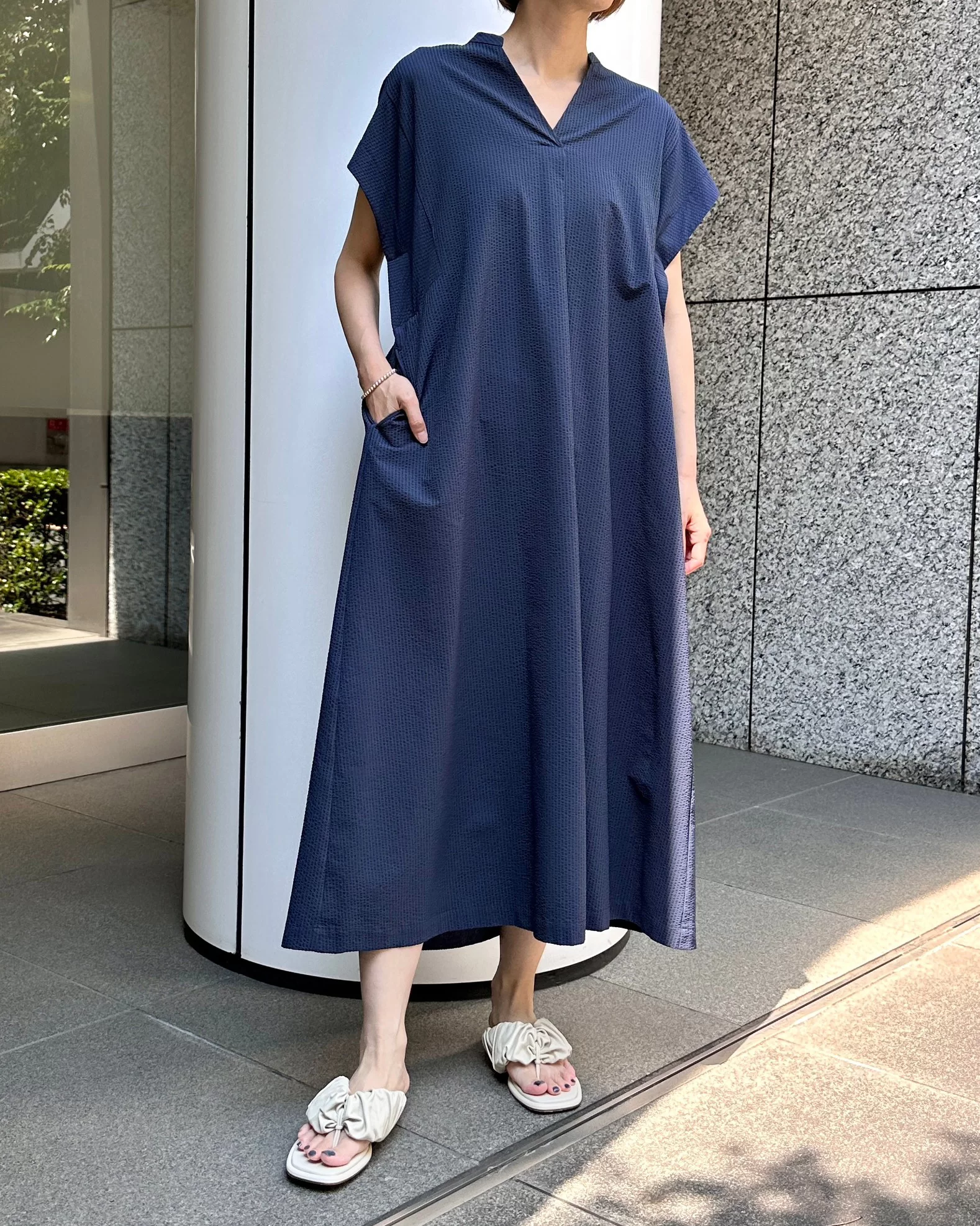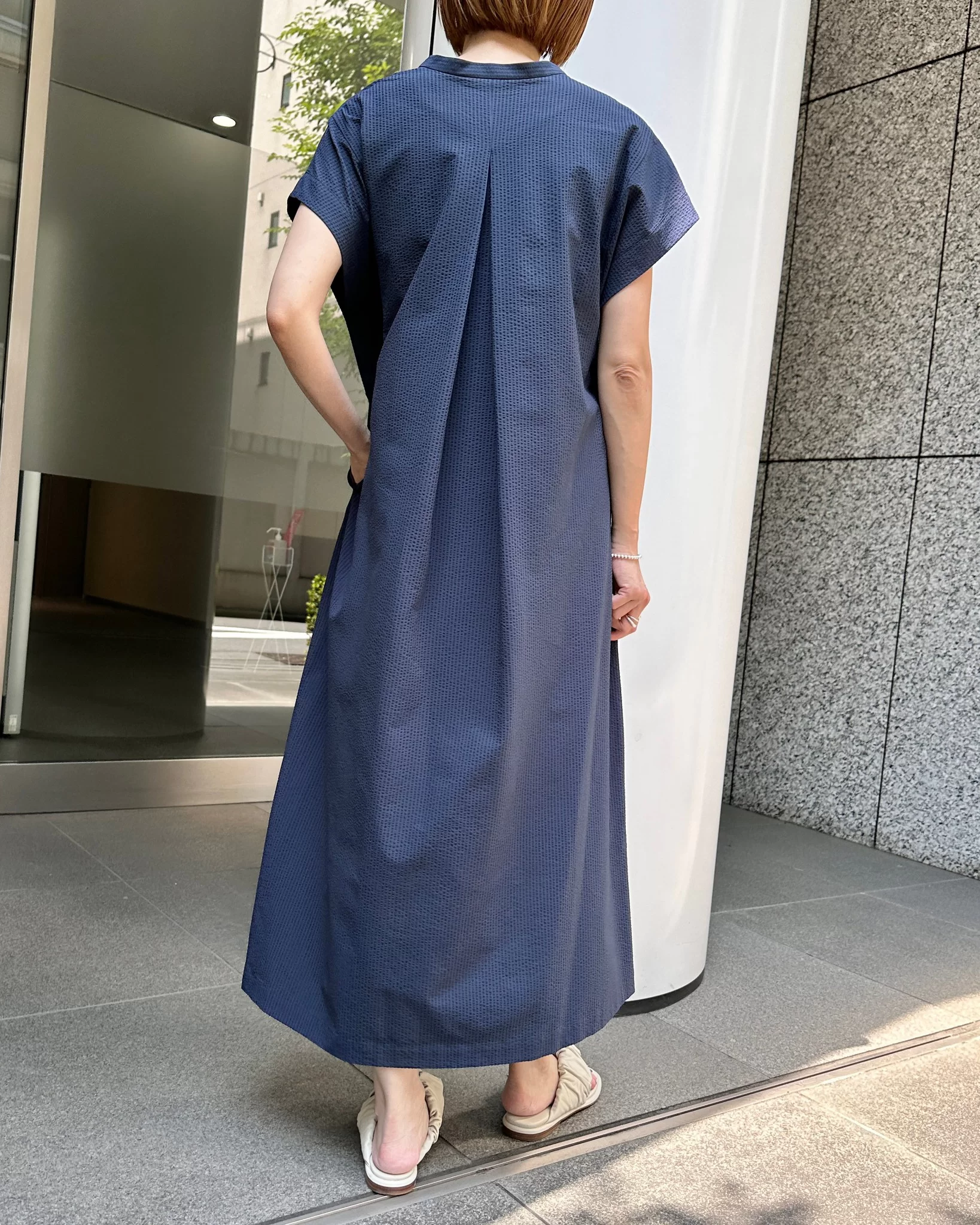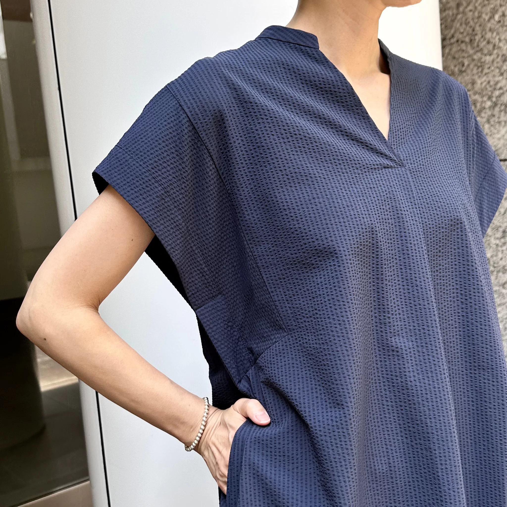 表面感のある夏の定番サッカー素材。適度な肉感で、透け過ぎない素材を使用しました。スキッパー衿下にはタックを施し、程よいゆとり感を持たせたデザインアクセントに。フロントタックが縦のラインを強調するので、裾分量がありながらすっきり見えするシルエット。肩が隠れる袖丈感もうれしいポイントです。レギュラー丈とロング丈の着丈違いでご用意しておりますので、小柄な方や足元を見せたい方にはレギュラー丈がおすすめです。