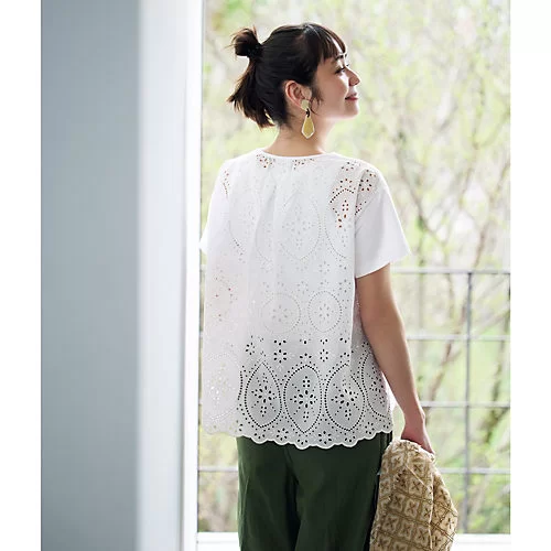 前はなめらかで丈夫な天竺コットン、後ろには透け感が美しいコットンのスカラップレースを使った、前後で異なる雰囲気が楽しめる切り替えTシャツ。背中の真ん中にタックを入れることで、やや裾広がりのリラックスしたシルエットを実現。体にまとわりつかず、真夏も涼しい着心地が味わえます。レースが苦手な人も、後ろだけならトライしやすいはず。