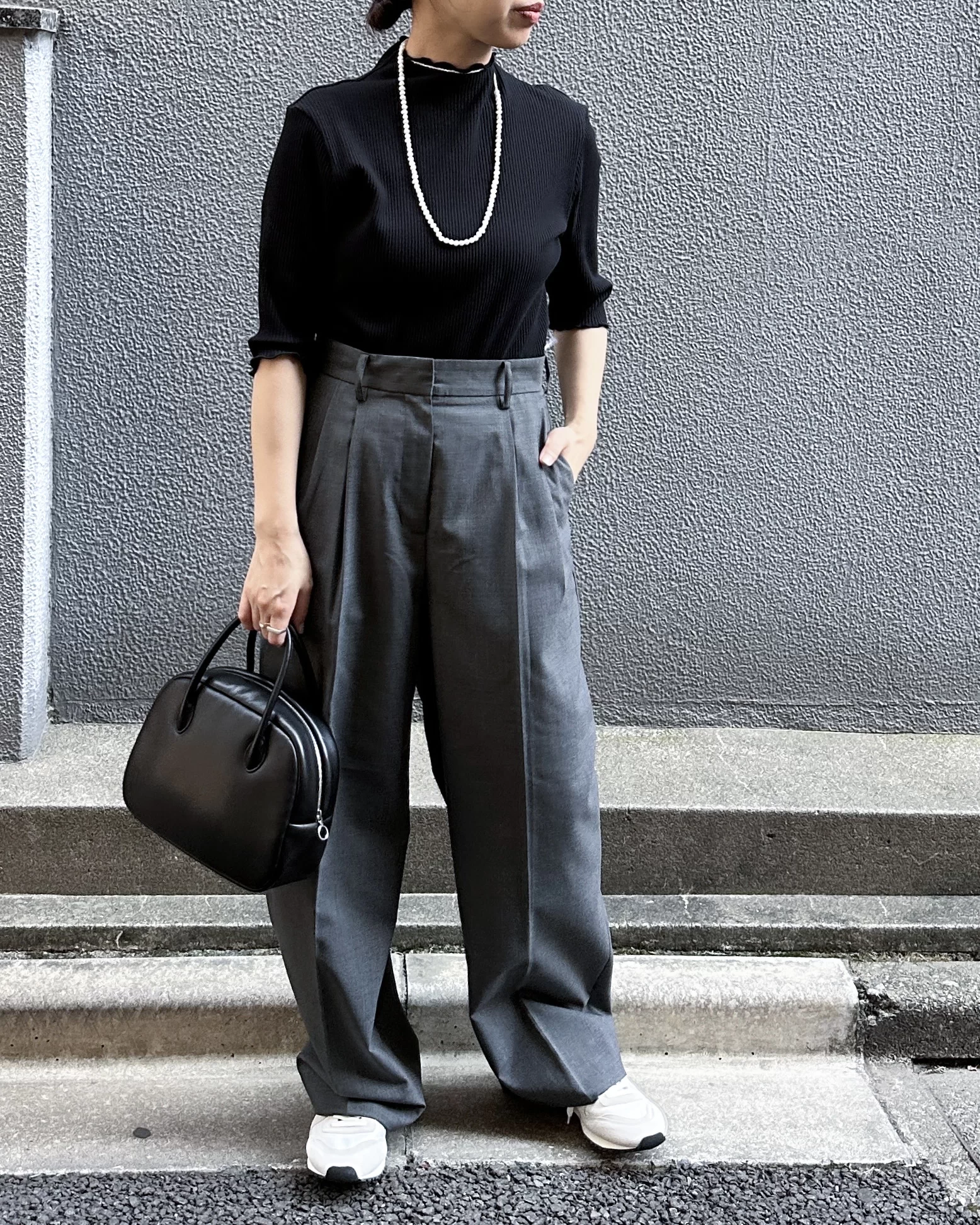 センタープラスがしっかりめに入っているので、ワイドパンツでもすっきり見えるのが魅力。ウール混の仕立て映えする素材は、カジュアルにもきちんとしたシーンにも合わせていただけます。スニーカーとも相性抜群!身長152cmで地面にすれすれの丈ですが、裾がたまる感じでメンズっぽく穿くのも好み。コンパクトなトップスをパンツにインして、バランス良くまとめました。