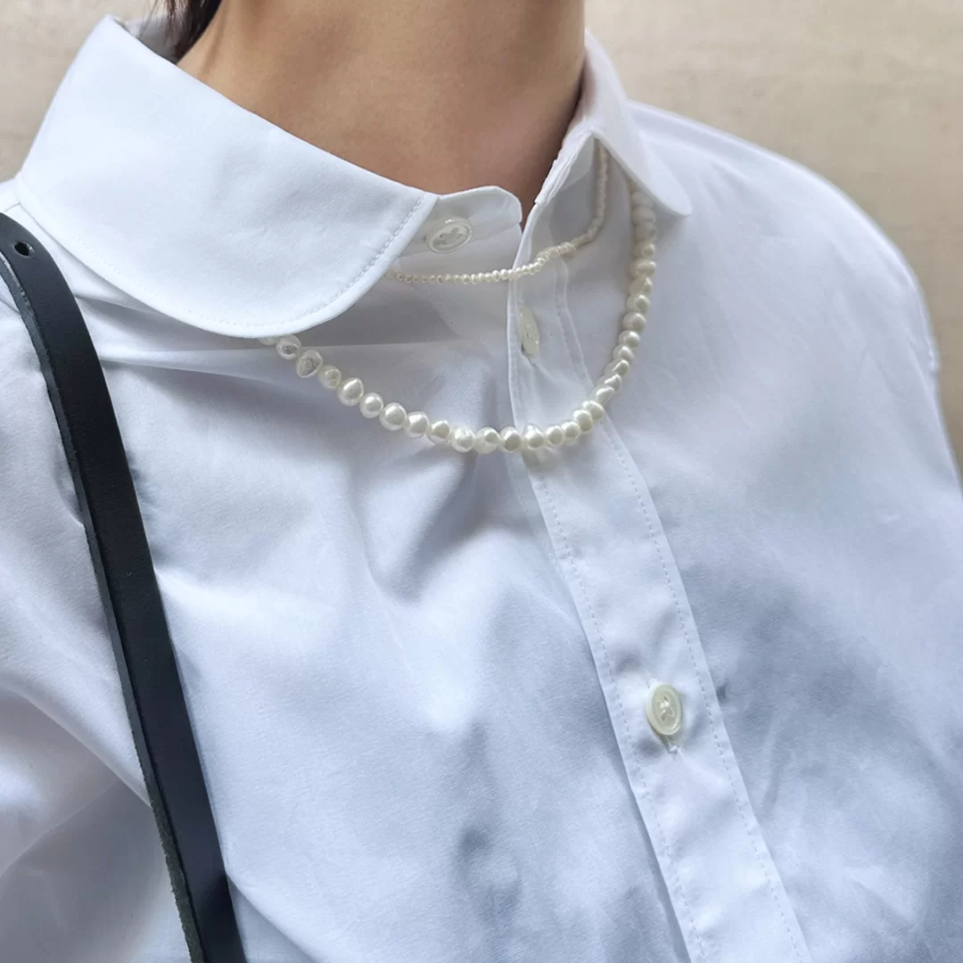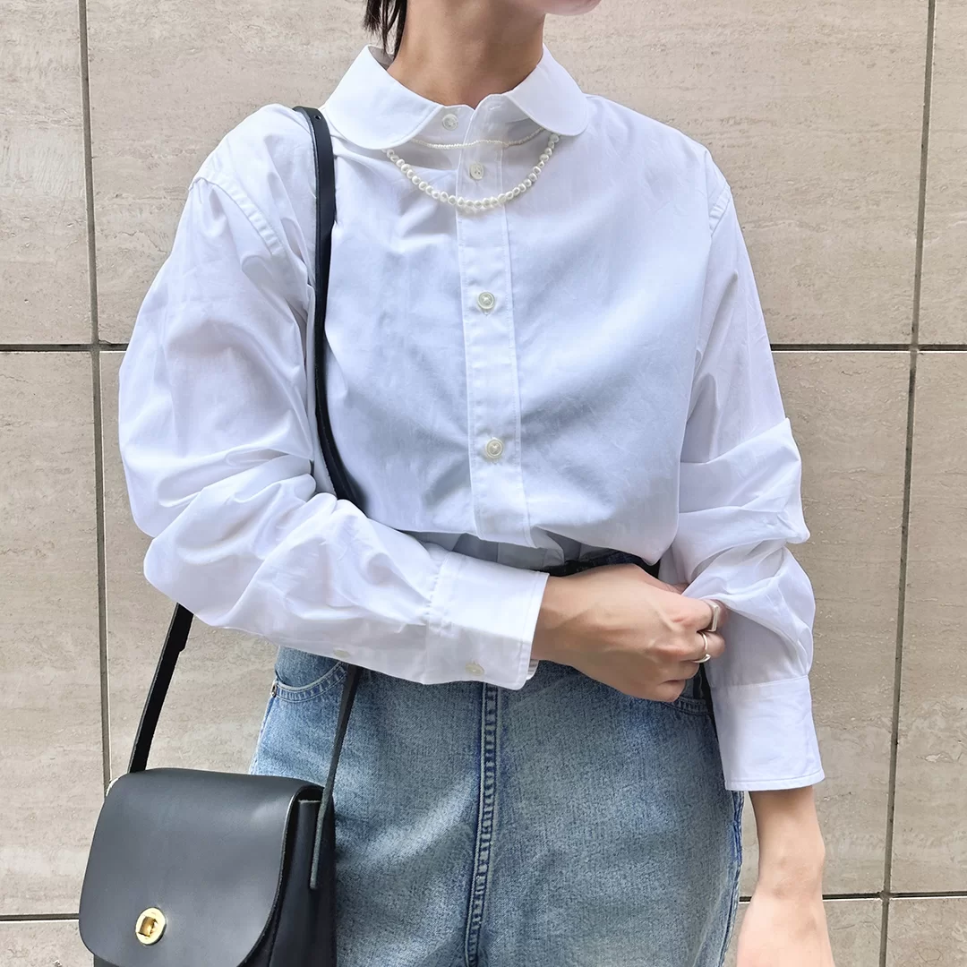 シルエットはベーシックでありながらも、ラウンド襟が印象的で大人の可愛げを演出してくれます。淡いデニムに合わせてほんのり辛口なカジュアルスタイルもおすすめです。シャツにデニムのシンプルなスタイルに、パールのネックレスを取り入れて上品な華やかさをプラスしました。