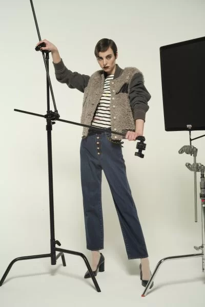 サテン地を使用したワッペンや、パール釦、ラメラインの入ったリブで女性らしいスタジアムジャンバー。軽いタッチの柔らかいエコファーと、ウール100%メルトンを使用。ストライプの地織の入った裏地はキルト加工し、さらに暖かく仕上げる。ボリュームのあるファーも着こなしやすい短めの着丈
