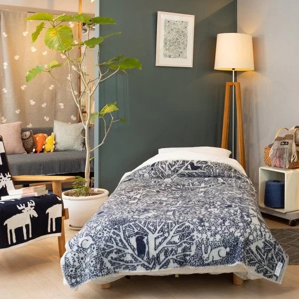 ミナ ペルホネンのデザイナー、皆川明氏が描いた、しんと静まり返った森や、夜空に浮かぶ月と星といった物語性のある情景。そんな繊細な絵柄を、クリッパン社の確かな技術で再現し、ふっくらと織り上げたブランケット。コラボがスタートした年に生まれた美しい一枚は、10年たった今も新鮮です。ラムウール100%の暖かさは一度使うと手放せなくなるほど。北欧の澄んだ空気を感じるグリーンと日本限定のネイビーの2 色展開。