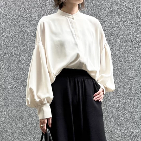 昨年コラボして大好評だったブラウスが復刻!顔まわりを華やかにみせてくれるボウタイブラウスは、オンオフ着回しできて幅広いコーディネートを楽しめます。ボウタイを外しても、袖のボリュームデザインが華やかな印象に。ニットパンツを合わせたリラクシーなスタイルもおすすめです。