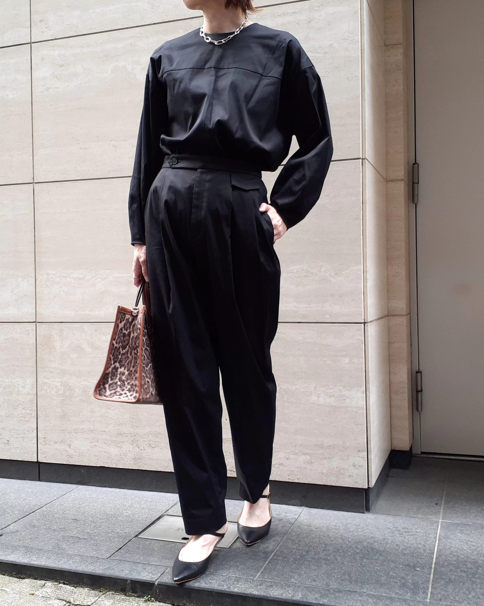 同素材のブラウスとパンツをセットアップで着用し、オールインワン風に。レオパード柄のバッグをアクセントに秋らしさをプラス。(身長164cm / サイズ38)