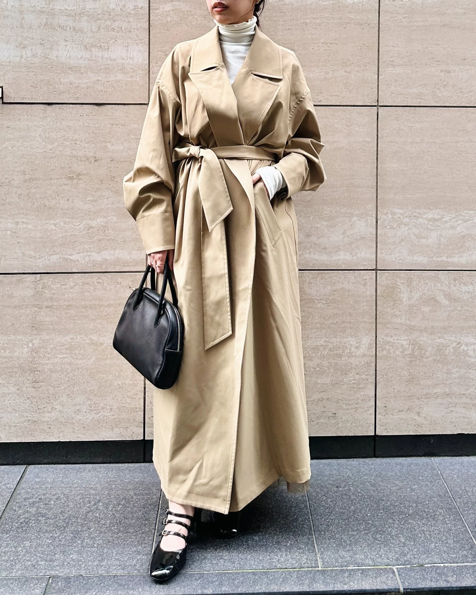 ロングコートをばさっとラフに羽織ったカジュアルコーデ。程よく張りのある素材は、さっと羽織るだけでカッコ良く決まります。ベルトはポケットに入れても良し、後ろで軽く結ぶとすっきりしたバランスに。