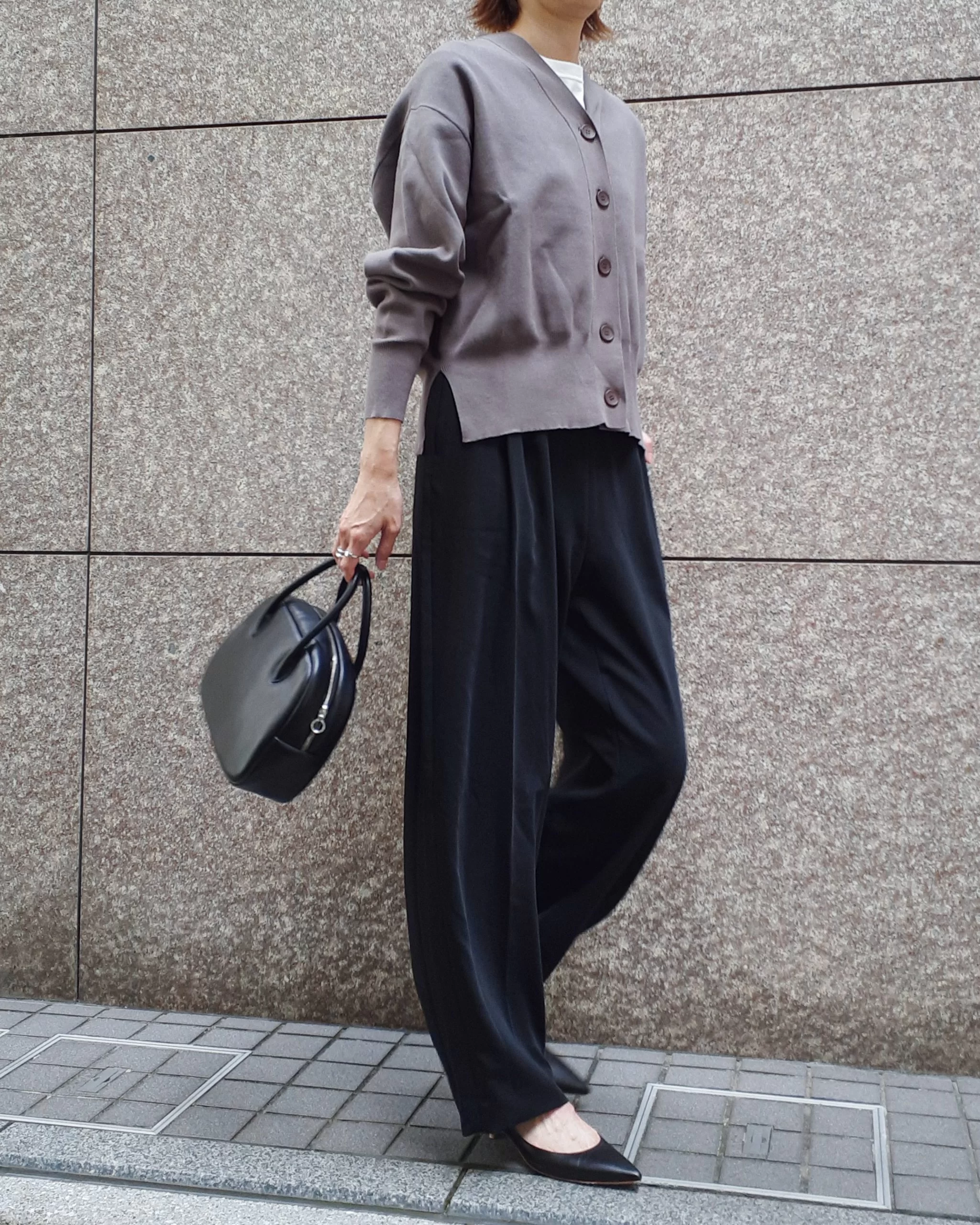 とろみパンツに合わせて、グレー×ブラックのクールなコーデ。シンプルな合わせもショート丈ニットが旬なバランスに。(身長164cm / サイズ38)