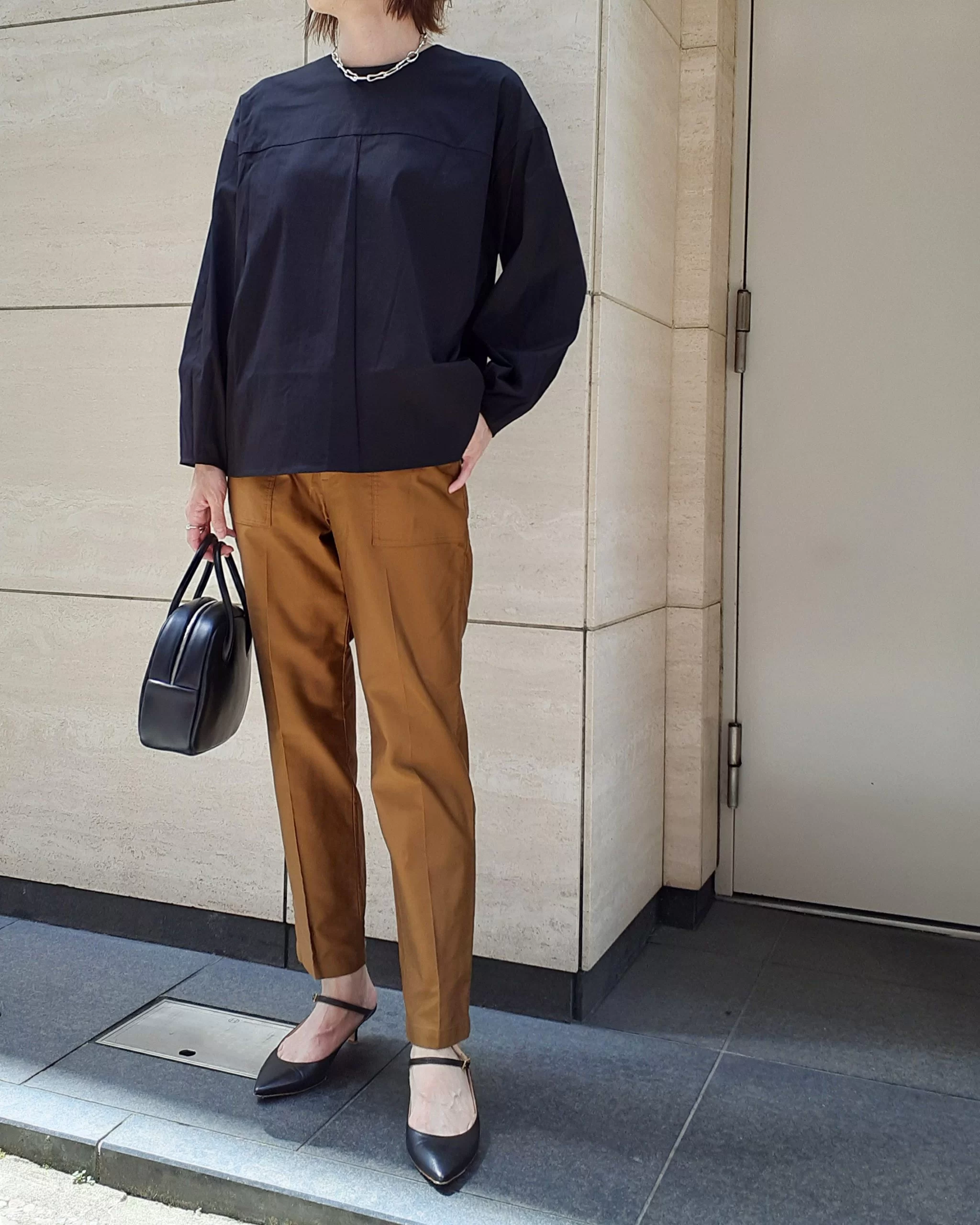 ロンT感覚で使えるブラウスを、ベイカーパンツに合わせてほんのりカジュアルに。ブラウスはコクーンシルエットなので、アウトで着てもサマになる!