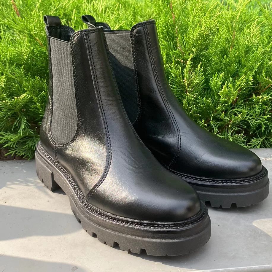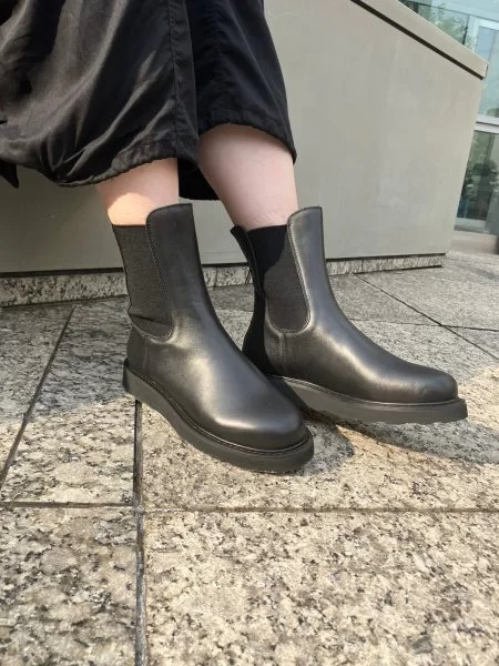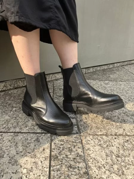 厚さ4cmのトラックソールでボリューム感を出しながら、フロントシームをやや内側に入れることでほっそりとした履き姿に着地した黒レザーのサイドゴアデザイン。一見重厚に見えますが、実際に履いていると屈曲性が高く軽やか。さらに安定感もあるのでサクサク歩けます。今っぽさも履き回し力も両得できる本革で、1 万円台というのもうれしい限り。