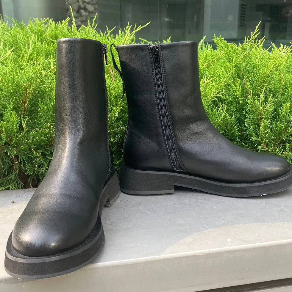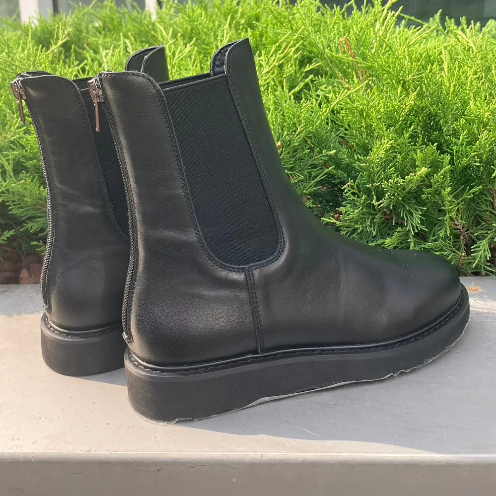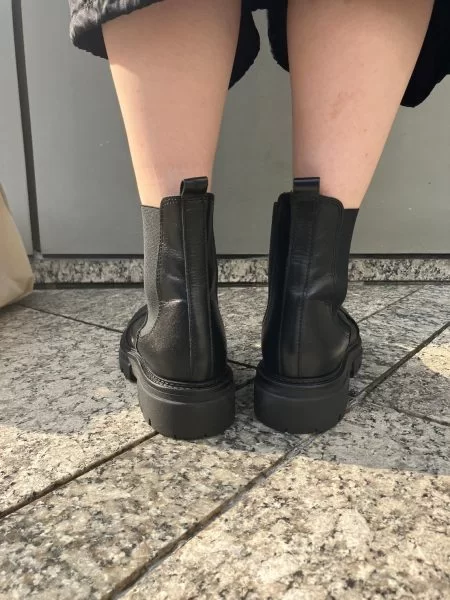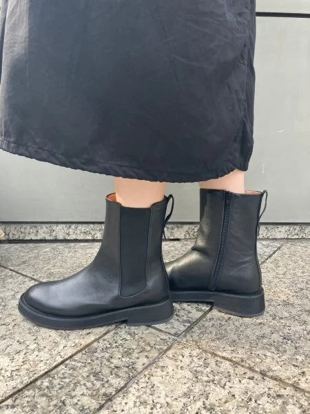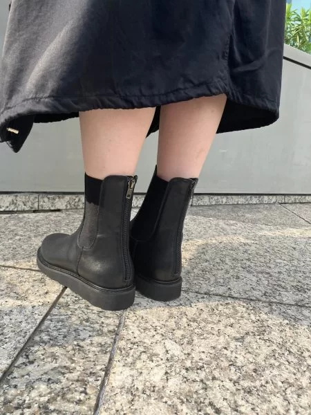筒が広めでサイドのジップが履きやすい一品。なじみの良いリアルレザーの質感がサイドゴアブーツながら、カジュアルすぎず上品に仕上がり嬉しいです。履き口部分のヒールループがポイントになり、後ろ姿もバッチリ!