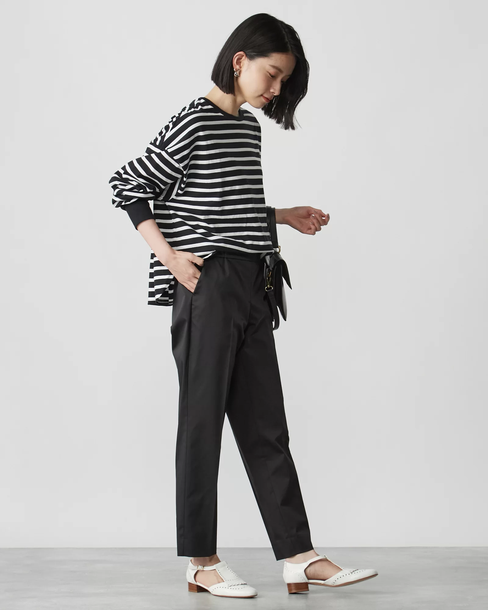 毎回ご好評いただいている、ウェストゴムパンツのパイオニア、「エムフィル」とのコラボパンツをピックアップ。ウエストゴムで楽な着心地なのに、きちんと見えする美シルエットで、オンオフシーンを問わずに着られるのが人気の理由。LIMONTA EASTのしわにならない機能素材を使用し、パッカブル仕様で持ち運びが便利なのも嬉しいポイント。着丈が選べる、アンクル丈とフルレングスの展開と、豊富なサイズ展開も魅力!