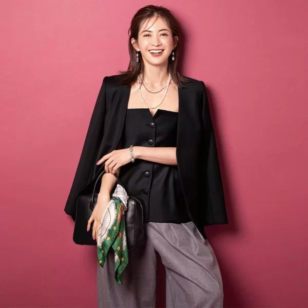 「ボウタイブラウスを合わせて華やかな印象に。トレンドの本命シャギー素材なら、シンプルなモノトーンも女性らしく感度の高いコーデに。ハイヒールとクラッチバッグでさらに女っぷりを上げて」