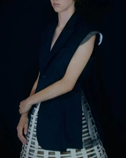 肩パット付きのジャケットを裁断し、リメイクしたような表情のスリーブレスジャケット。サイドにはややハリのあるチュールで切り替え、シェイプしたウエストラインできりっと都会的に。