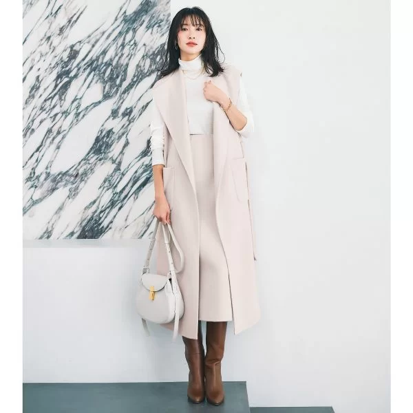両サイドには深めのスリットを入れ、しっかりと長いマキシ丈でも脚さばきが軽やか。ボリュームのあるスカートやワイドパンツを合わせてもまとわりつきにくく、すっきり見えにもひと役。光の当たり方によってベージュにもグレーのようにも見えるニュアンス色は、どんな色ともなじみやすくヘビーユース確実。ウールならではの温かみのある風合いで、アウターとしても活躍。伸縮性があるので、厚手のニットに重ねてもノンストレス。