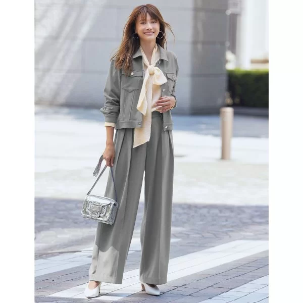 鮮度の高いGジャン風ジャケットはカジュアルなディテールながら、ウール調のなめらか素材でシックな表情。身頃と腕まわりはゆったりしながら、着丈は短めなので着るだけでスタイルアップ。ワイドパンツは深いタックとセンタープレスが立体的な美脚フォルムを描く。吸湿発熱性のある裏起毛素材はこれからの時季に暖かく重宝。